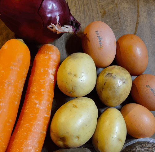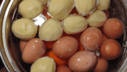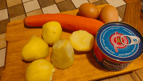 В большой кастрюле поставить вариться яйца и все предварительно очищенные овощи (картофель и морковь).