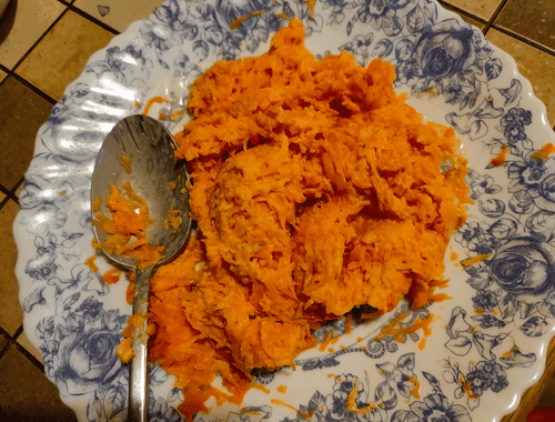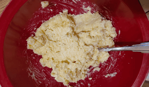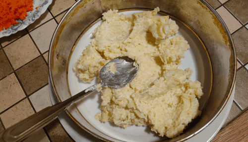 Горбушу размять вилкой до мелкого состояния.