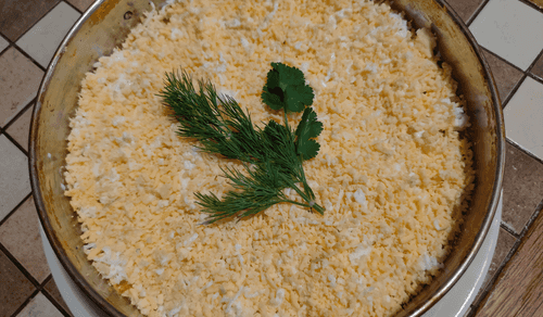 Заключительным слоем будет желток, также распределить его по всей поверхности салата и сверху украсить несколькими веточками зелени.