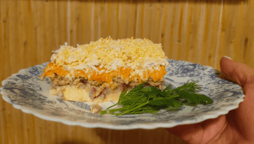 Салат «Мимоза» – это нежное и воздушное блюдо, которое появилось в советские годы и завоевало сердца гурманов своим утонченным вкусом и изысканной подачей. Названный в честь весеннего цветка, он радует глаз золотистым слоем тертого желтка, напоминающим пушистые соцветия мимозы. Сочетание мягкого картофеля, сладковатой моркови, нежного рыбного слоя из консервированной горбуши и пикантного лука создают гармонию вкусов, а майонезные прослойки придают блюду сливочную текстуру. Этот салат традиционно подается на праздничных застольях, символизируя тепло, уют и домашнее гостеприимство. Его подача в слоях делает каждый кусочек особенным, а нежность ингредиентов заставляет наслаждаться каждым мгновением его дегустации.