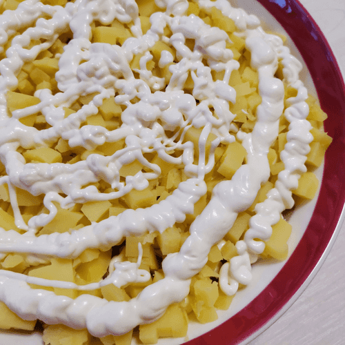 Следующим слоем выложить картофель и смазать майонезом сверху.