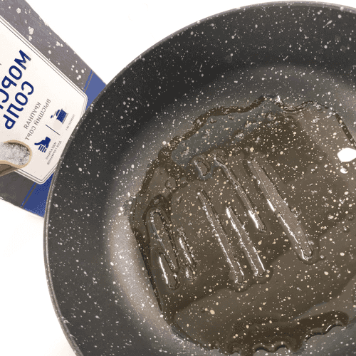 На сковороде разогреть оливковое масло со щепоткой крупной морской соли.