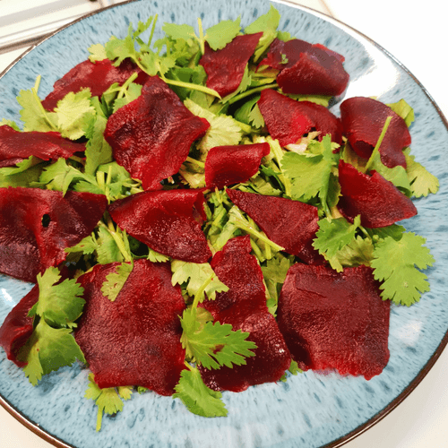 Свеклу нарезать овощерезкой тонкими слайсами.