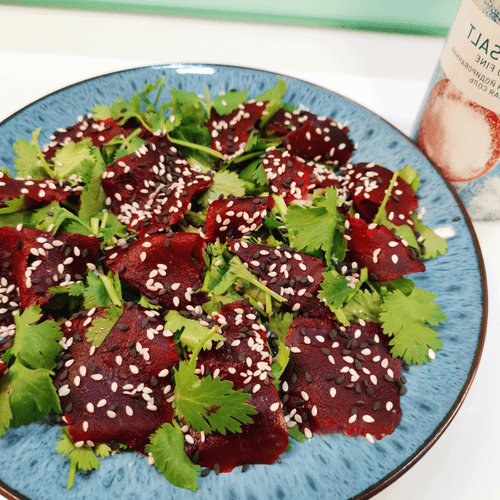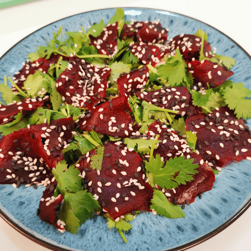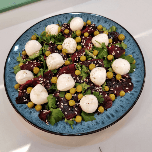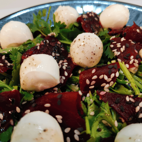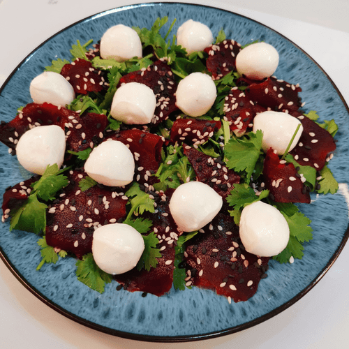 Салат из свеклы с моцареллой — это гармония вкусов и текстур, вдохновлённая традициями русской кухни. Его корни уходят к простым деревенским рецептам, где свекла всегда была важным ингредиентом, богатым полезными веществами. В этом блюде сочетаются сладковатая нежность варёной свеклы, свежая зелень петрушки и кинзы, пикантный аромат кунжута и сбалансированная кислинка винного уксуса. Мини-моцарелла добавляет сливочную мягкость, а зеленый горошек — лёгкую текстурную вариацию. Заправленный оливковым маслом и пряностями, этот салат становится отличным дополнением к любому столу, привнося лёгкость и изысканность. Его подают как самостоятельное блюдо или как закуску к основным угощениям, подчеркивая богатство вкусов русской гастрономии.