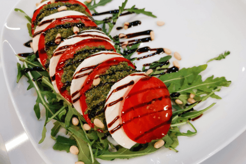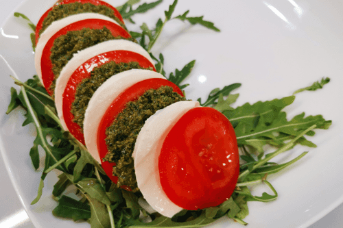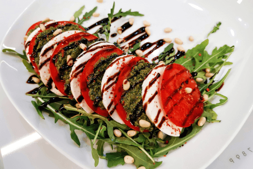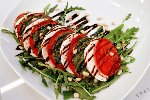 Салат Капрезе — это квинтэссенция итальянской кухни, воплощение её простоты и утончённости. Родом из солнечного острова Капри, этот салат сочетает свежесть помидоров, нежную текстуру моцареллы и ароматный соус песто. Рукола добавляет лёгкую пикантность, а кедровые орехи — хрустящую текстуру. Бальзамический соус придаёт приятную кислинку, а оливковое масло подчёркивает натуральный вкус ингредиентов. Этот салат не только радует глаз своими контрастными цветами, но и идеально подходит как лёгкая закуска или сопровождение к итальянским блюдам. Капрезе — это летняя свежесть на тарелке, которая переносит вас в атмосферу средиземноморского побережья. Присыпанный перцем чили, он может обрести неожиданную пикантную нотку, делая его ещё более изысканным.