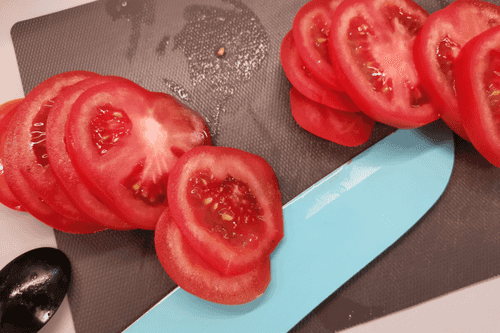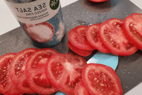 Нарезать помидоры слайсами.