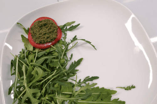 Выложить на блюдо слайс помидора, смазанный песто (примерно 1 столовой ложкой).