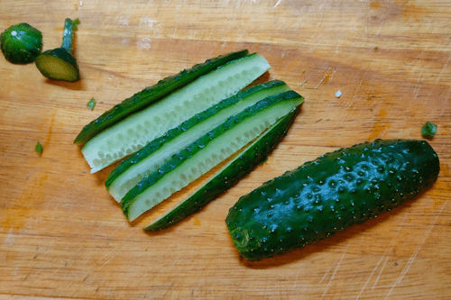 Огурец разрезать вдоль пополам, затем каждую половинку вдоль на несколько частей.