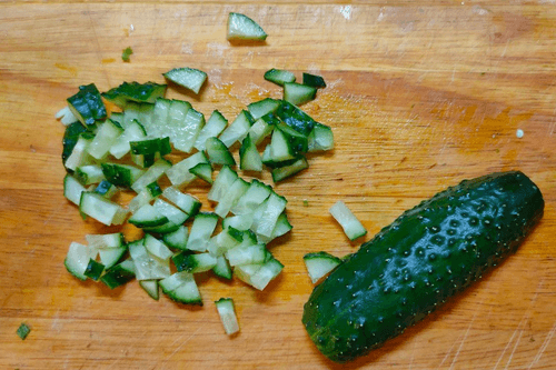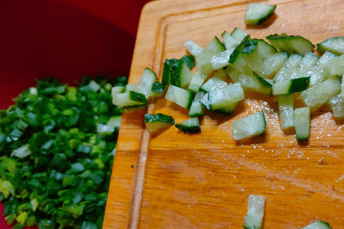 Нарезанные мелкие кусочки огурца сложить в миску с луком.