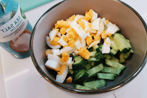 Мелко нарезать яйцо. Объединить с огурцами в глубокой миске и посолить.