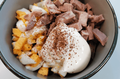 Добавить майонез и молотый черный перец.