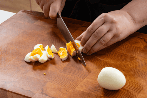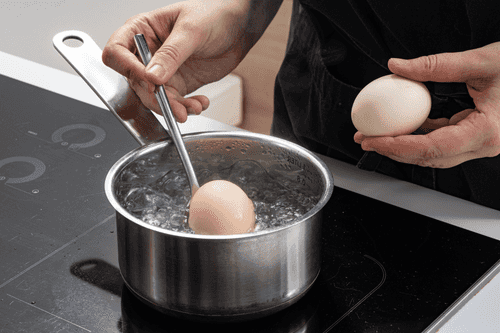 Яйца отварить вкрутую, а затем охладить под струей холодной воды.