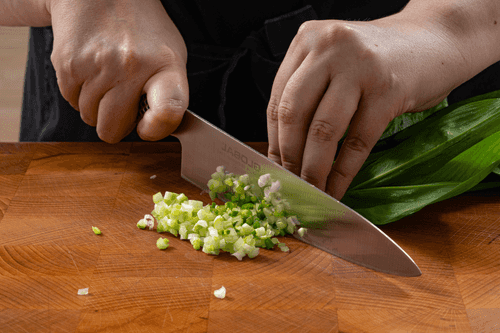 Черемшу нарезать вместе со стеблями. Стебли нарезать мелко, а листья — тонкими полосками.