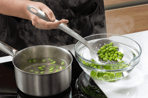 Эдамамэ бланшировать в кипящей воде в течение 1 минуты, а затем переложить в холодную воду, чтобы остановить приготовление.