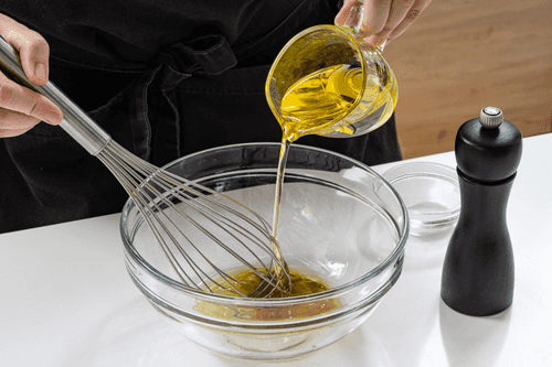 Для заправки смешать в большой миске горчицу с яблочным уксусом с помощью венчика. Затем, не переставая взбивать, влить тонкой струйкой масло. Посолить и поперчить.