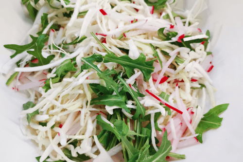 Объединить капусту и редис в глубокой миске, добавить руколу.