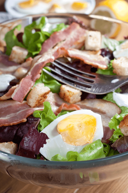 Отварить яйца вкрутую, нарезать на четвертинки. Бекон запекать на гриле по несколько минут с каждой стороны, порезать маленькими кусочками. Подсушить хлеб в духовке и нарезать на кубики.