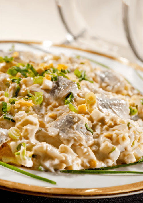 Салат с сельдью и яблоком — это яркий представитель русской кухни, сочетающий в себе традиционные и освежающие вкусовые нотки. Истоки этого блюда уходят в глубину народных кулинарных традиций, где селёдка всегда была важным элементом праздничного застолья. Солёная сельдь придаёт салату насыщенность и пикантность, а яблоко и лук — легкую кислинку и свежесть. Добавление кукурузы и зелёного горошка вносит мягкость и сладковатые оттенки, балансируя вкус. Заправленный ароматным растительным маслом, этот салат идеально подходит как самостоятельное блюдо или в качестве закуски. Он особенно хорош в прохладные вечера, когда хочется чего-то одновременно сытного и освежающего. Простой в приготовлении, но удивительно гармоничный по вкусу, он прекрасно дополнит традиционный русский стол.