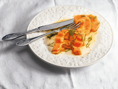 Залить этим соусом половинки папайи, посыпать рублеными листьями мяты и базилика и цедрой лайма. Поставить на десять минут в холодильник мариноваться.