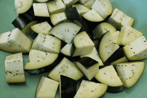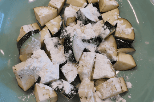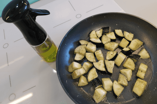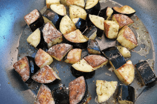 Выложить на сковороду баклажан. Обжаривать 3–4 минуты на сильном огне, можно добавить еще немного масла.