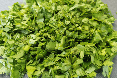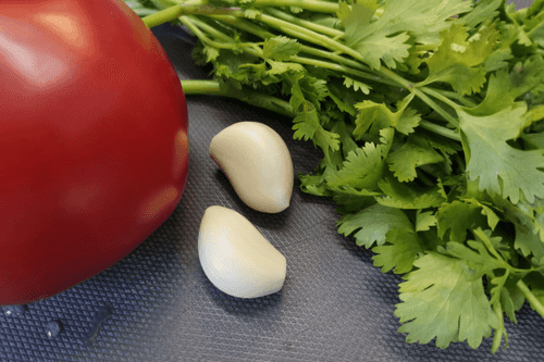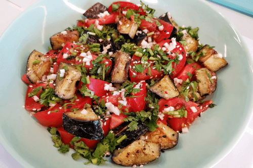 Выложить зелень, томаты и баклажаны на блюдо. Добавить чеснок и кунжут. Заправить нерафинированным маслом, перемешать и подавать.
