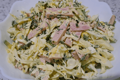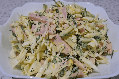 Салат из молодой капусты с ветчиной – это легкое и освежающее блюдо европейской кухни, которое сочетает в себе свежесть молодых овощей и насыщенность мясного вкуса. Молодая капуста придает салату хрустящую текстуру, а ветчина – приятную солёность и глубину вкуса. Добавление яиц делает его более сытным, а зелень – ароматным. Майонез «Провансаль» объединяет все ингредиенты в гармоничное целое. Такой салат идеально подходит для весенне-летнего сезона, когда хочется свежих и легких блюд. Он станет прекрасным дополнением к основным мясным и рыбным блюдам, а также подойдет для самостоятельного употребления в качестве лёгкого ужина или закуски. Этот салат можно подавать на праздничный стол или включать в повседневное меню, радуя себя и близких простой, но изысканной гастрономической композицией.