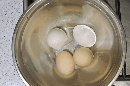 Яйца варить 10 минут. В воду предварительно добавить щепотку соли. Отваренные яйца залить холодной водой.