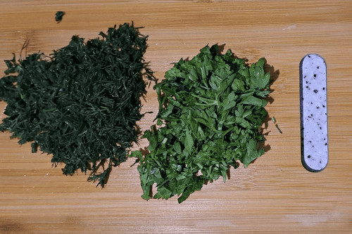 Укроп и петрушку хорошо вымыть под проточной водой, высушить и мелко нарезать.