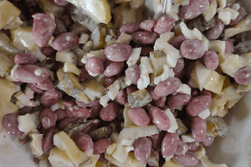 Салат с фасолью, соленым огурцом, яйцом и картофелем
