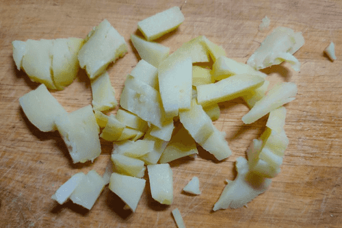 Нарезать картофель небольшими кусочками — соломкой или кубиками, сложить в миску к остальным продуктам.
