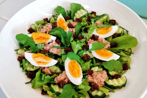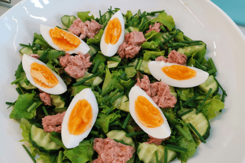 Овощной салат с тунцом — это легкое, но питательное блюдо европейской кухни, в котором свежесть зелени гармонично сочетается с насыщенным вкусом тунца. Его корни можно искать в средиземноморской гастрономии, где ценят баланс полезных ингредиентов и натуральных вкусов. Салатные листья, освежающие огурцы и пикантный шнитт-лук создают яркую текстуру, а нежные кусочки тунца придают насыщенность. Яйца, добавленные в блюдо, делают его более сытным, а вяленые томаты добавляют легкую сладковато-кислую нотку. Этот салат подходит как для легкого обеда, так и для ужина, а благодаря простоте приготовления его легко приготовить дома всего за несколько минут. Идеальный выбор для тех, кто ценит полезную и вкусную еду!