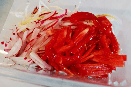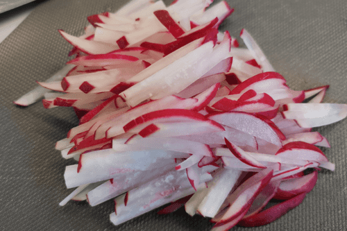 Нарезать редис тонкой соломкой.