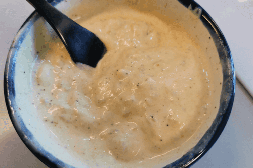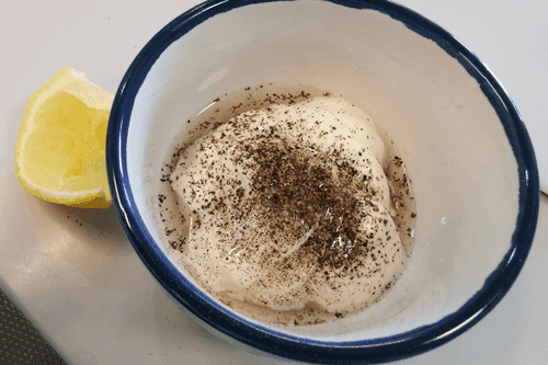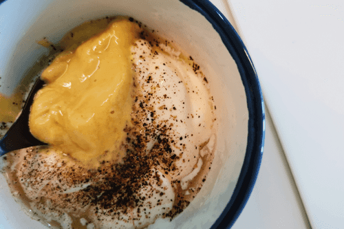 Для соуса выложить майонез в миску для смешивания и поперчить.