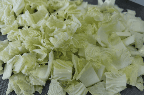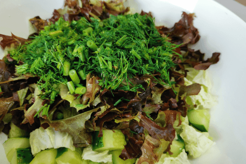Нарезать огурцы и выложить их с капустой в миску для салата.