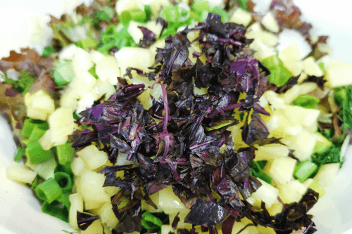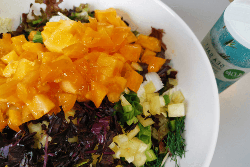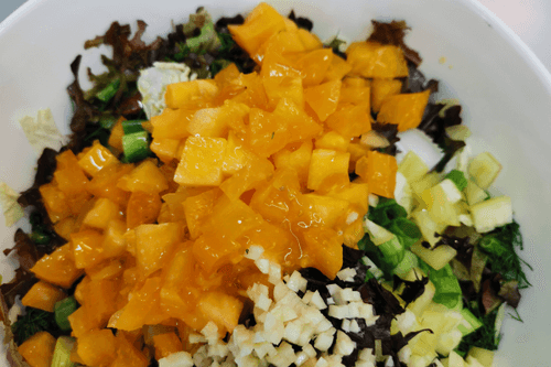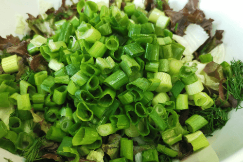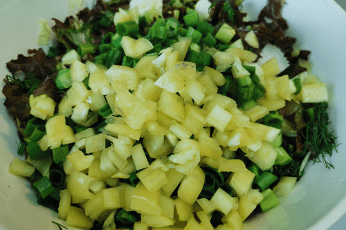 Мелко нарезать помидоры, добавить в салат и посолить.