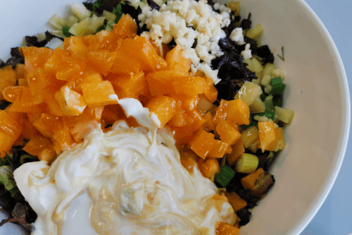 Заправить соусом из майонеза, горчицы и оливкового масла.