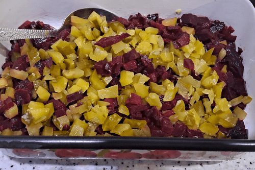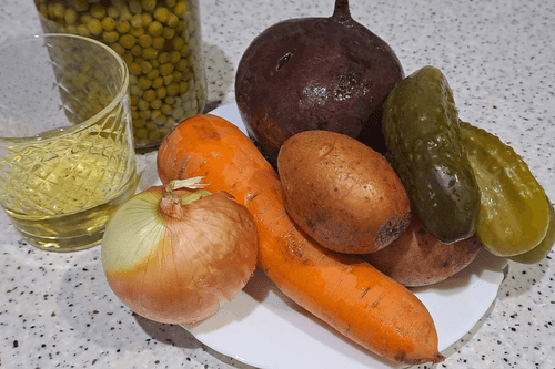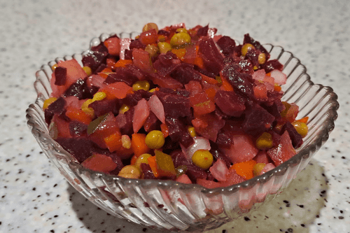 Винегрет с зеленым горошком и соленым огурцом — яркое блюдо европейской кухни, любимое многими поколениями. Его корни уходят в XIX век, когда сочетание варёных овощей с маринованными продуктами стало популярным в России. Этот салат поражает своей цветовой палитрой: рубиновая свёкла, золотистая морковь, нежно-зелёный горошек и пикантные огурцы создают настоящую картину на тарелке. Вкус винегрета — гармония сладковатой свёклы, свежего хруста огурцов и лёгкой кислинки, подчёркнутой подсолнечным маслом. Это универсальное блюдо подходит и для повседневных трапез, и для праздничного стола, хорошо сочетается с мясными и рыбными закусками. Винегрет не только вкусный, но и полезный, богатый витаминами и клетчаткой, делая его отличным выбором для тех, кто следит за своим рационом.