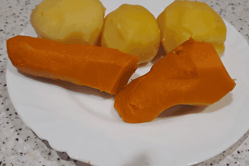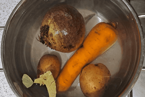 Примерно через 20–30 минут достать из кастрюли готовый вареный картофель и еще минут через 10–20 достать вареную готовую морковь. Овощи немного остудить и очистить от кожуры.
