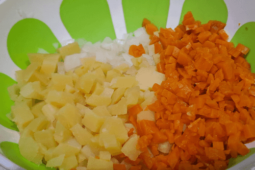 Картофель и морковь нарезать мелким кубиком и выложить в миску. Лук очистить и хорошо промыть под проточной водой, немного просушить, нарезать мелким кубиком и добавить к нарезанным моркови и картофелю.