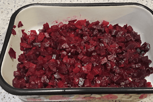 Готовую вареную свеклу остудить, очистить, нарезать мелким кубиком и выложить в емкость с маслом. Свеклу перемешать с подсолнечным маслом и дать постоять примерно 10–15 минут.