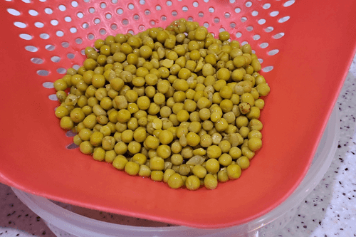 250 грамм консервированного зеленого горошка выложить в дуршлаг, чтобы стекла лишняя жидкость.