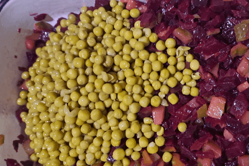 Выложить в емкость со свеклой и огурцами консервированный горошек.