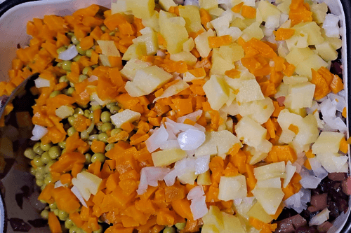 Добавить к свекле, огурцам и горошку подготовленные картофель лук и морковь.