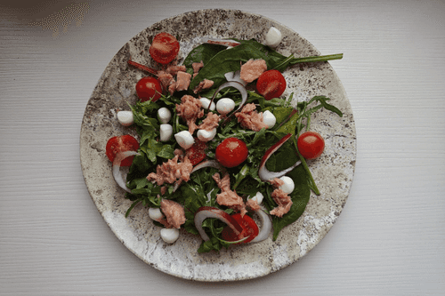 Этот салат с тунцом, моцареллой и помидорами черри — воплощение свежести и легкости средиземноморской кухни. Он объединяет нежность тунца, сливочный вкус мини-моцареллы и яркую кислинку черри, создавая гармоничный баланс вкусов. Листья салата добавляют хрустящую текстуру, а тонкие перья красного лука придают пикантную нотку. Завершающим акцентом служит ароматное оливковое масло, которое обогащает вкус блюда и делает его еще более изысканным. Этот салат идеально подходит как легкий обед, дополнение к основному блюду или даже праздничная закуска. Вдохновленный средиземноморскими традициями, он привносит ощущение солнечного побережья и умиротворенности, делая каждый прием пищи особенным.