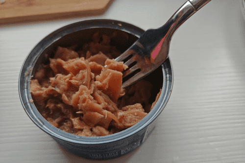 Из консервированного тунца слить лишнюю жидкость и кусочки размять вилкой.