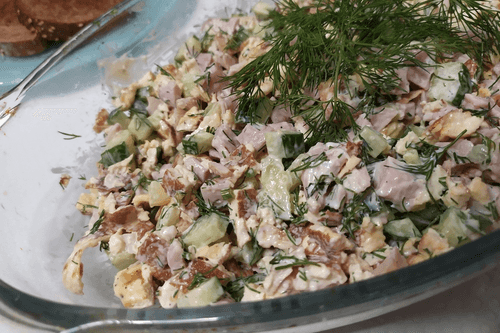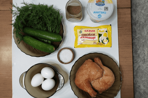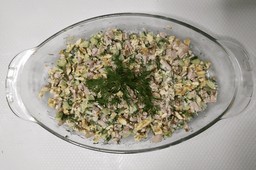 Салат с яичным блинчиком, свежим огурцом и копченым цыпленком
