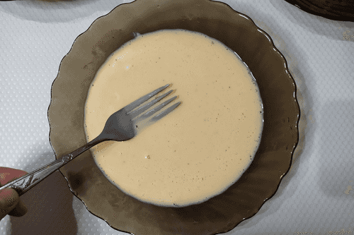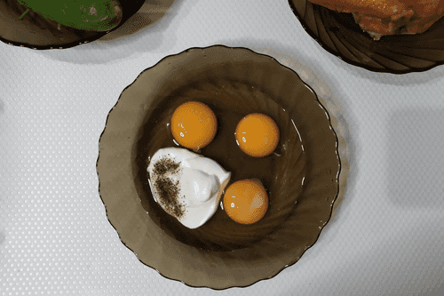 Сначала приготовить яичный блинчик. Разбить 3 яйца, добавить 1 столовую ложку сметаны с горкой, соль и молотый черный перец.