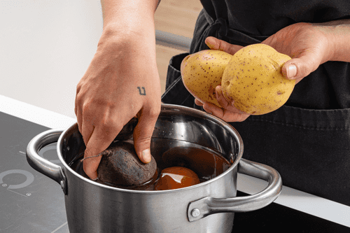 Свеклу, картофель и морковь отварить, не очищая кожуры. Сначала будет готова морковь (через 20 минут), потом картофель (30–35 минут), на варку свеклы уйдет не меньше 1 часа. Готовность можно проверить шпажкой или ножом: он должен легко входить в мякоть. Дать овощам остыть, пока подготавливаются другие ингредиенты.