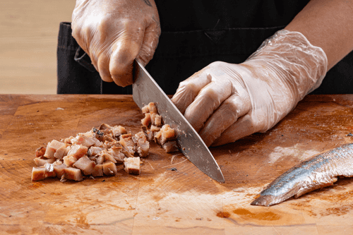 Сельдь разделать на филе, тщательно вынув все кости, нарезать кубиками со стороной 1 см.