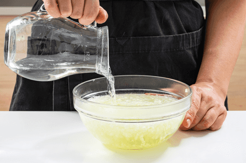 Лук нарезать мелкими кубиками и ошпарить кипятком.